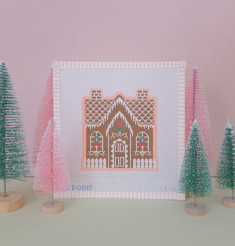 Our Christmas Village Gingerbread House canvas is a beautiful 5.75” x 6.25” design, hand painted on 13 mesh canvas. Total canvas size is 9.75” x 10.25”.
