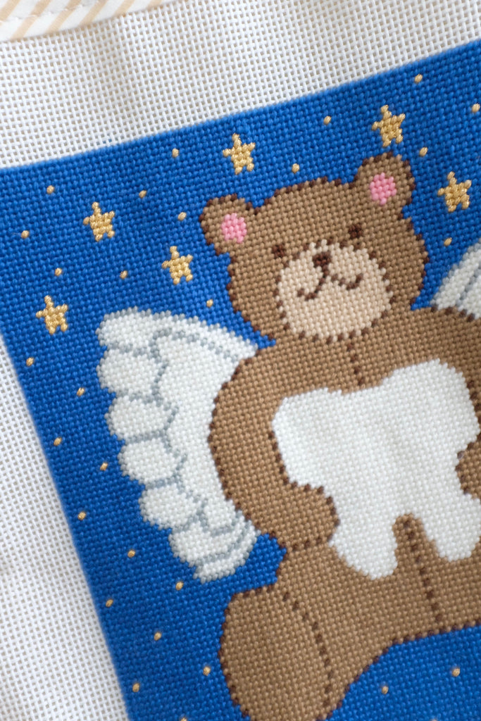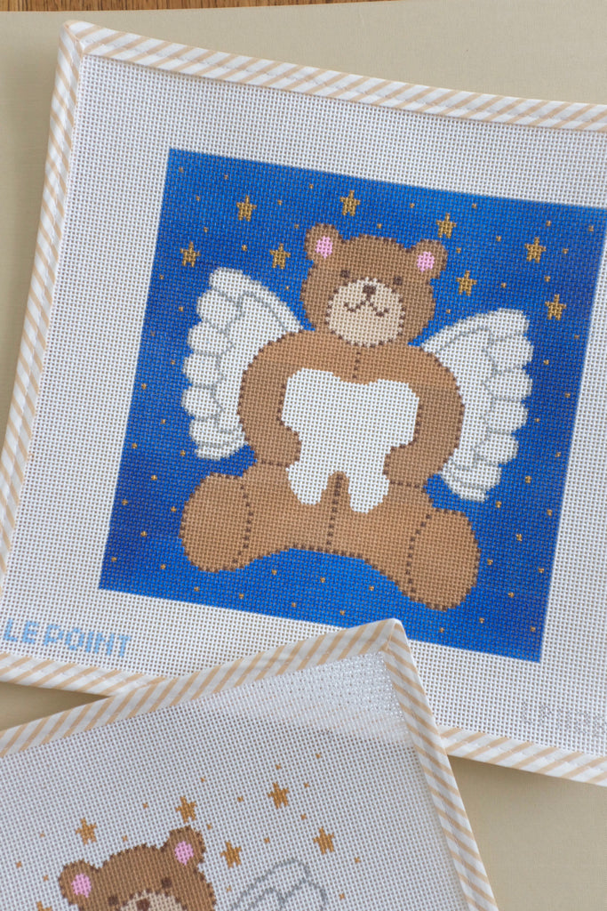 Our Tooth Bear-y Pillow is a hand painted needlepoint canvas on 13 mesh that is an 8 x 8 design with a total canvas size of 12 x 12.