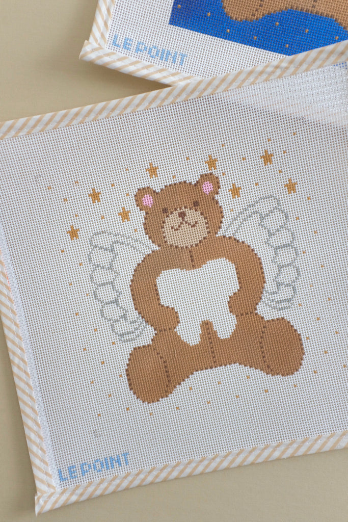 Our Tooth Bear-y Pillow is a hand painted needlepoint canvas on 13 mesh that is an 8 x 8 design with a total canvas size of 12 x 12.